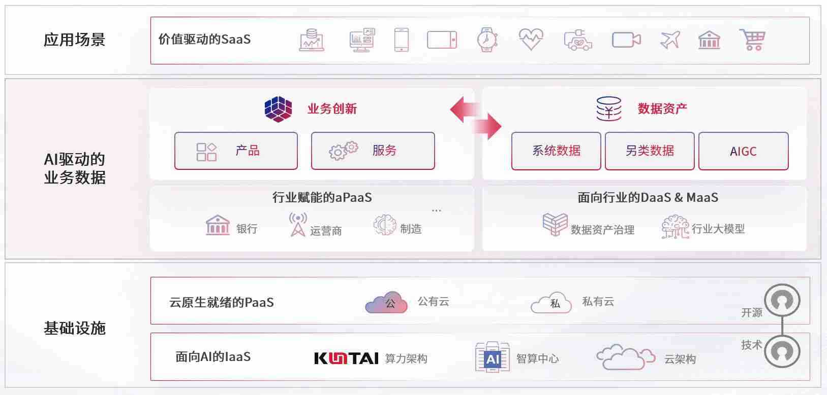 数字时代,,,,围绕企业数字化转型的关键要素,,J9娱乐数码开创性的提出数云融合战略和技术体系框架,,,,着力在云原生、、、数字原生、、AI原生和信创产业上架构产品和服务能力,,,为处在不同数字化转型阶段的快消零售、、、、汽车、、、、金融、、医疗、、、政企、、、、教育、、、、运营商等行业客户提供泛在的敏捷IT能力和融合的数据驱动能力,,,,构建跨界融合创新的数字业务场景和新业务模式,,,,助力企业级客户建立面向未来的核心能力和竞争优势,,,全面推动社会的数字化、、智能化转型升级。。