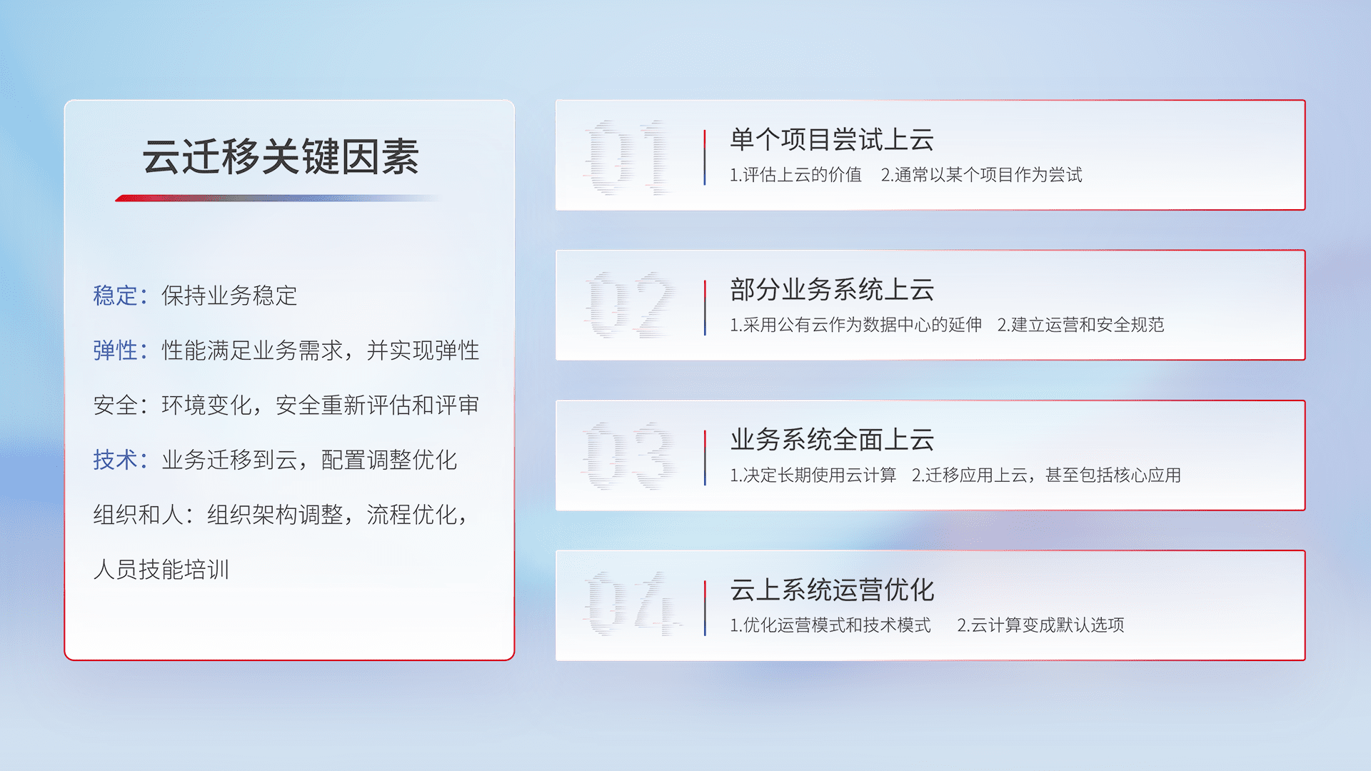 结合实际业务,,,,从规划设计、、、云平台选型、、云原生改造、、数据迁移、、、集成交付,,迁移全过程为客户识别最佳上云路径,,做好风险识别管理,,,,设计网络架构、、、身份权限、、、、安全审计合规、、、、操作审计、、、、日志审计、、、监控告警策略、、、多站点容灾设计等,,对云上基础设施进行整体规划,,,提升IT治理水平,,,以满足弹性、、、高可用、、、、高性能的需求。。。