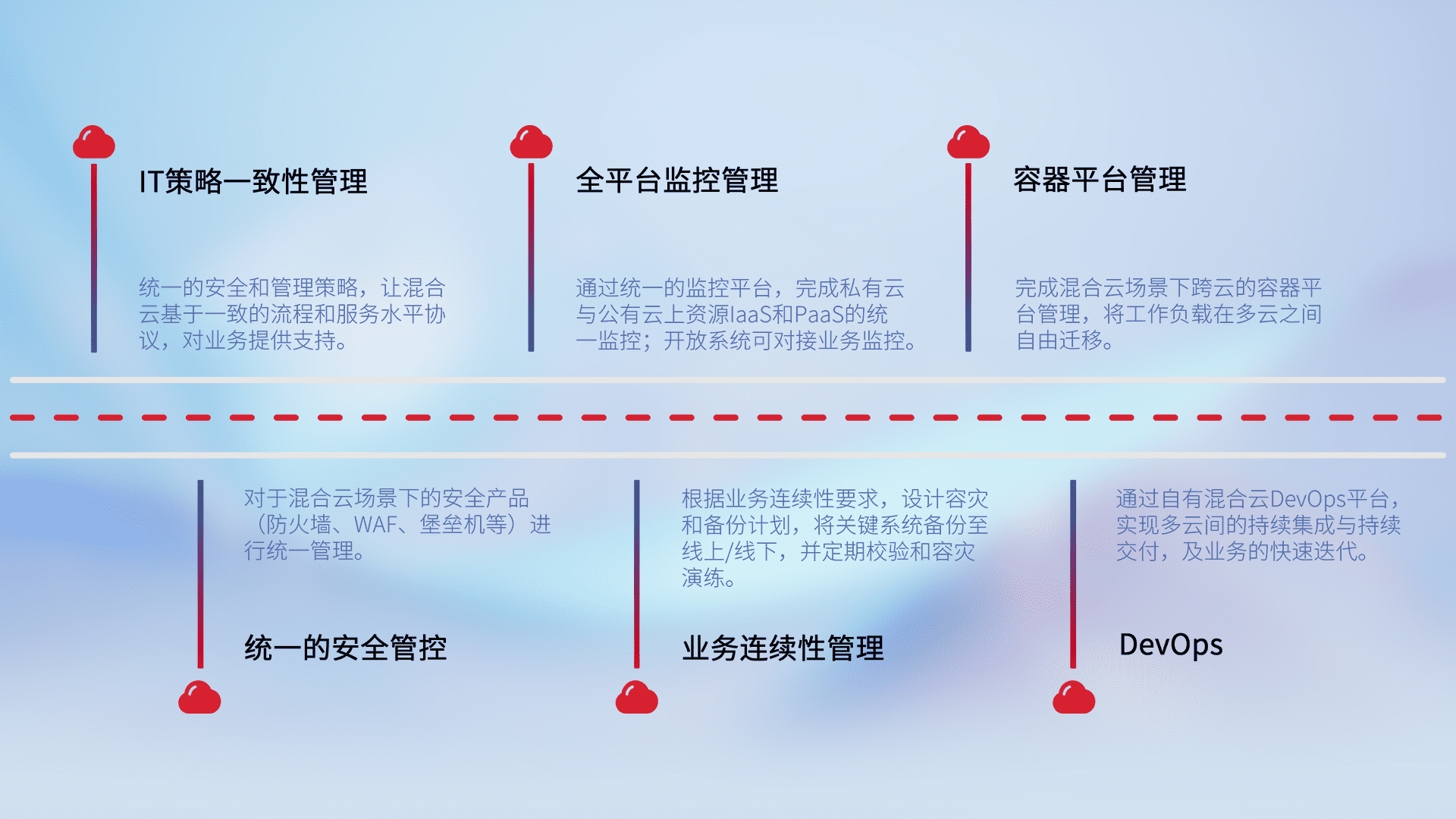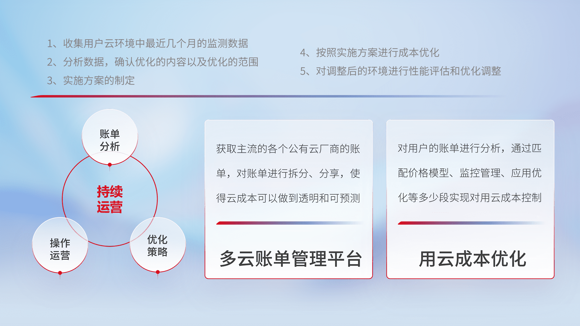 通过多云纳管,,以统一的资源数据模型把客户的云资源进行抽象和封装,,进而实现对多云资源的统一操作,,,保障云资源管理的可靠性、、、稳定性与可用性。。。量身定制化运维内容,,配置、、、、开发运维、、补丁管理、、、、备份、、监控、、、认证和访问管理、、、审计和日常巡检等,,,,保障在用云过程中的可靠度,,稳定度以及高可用率。。。